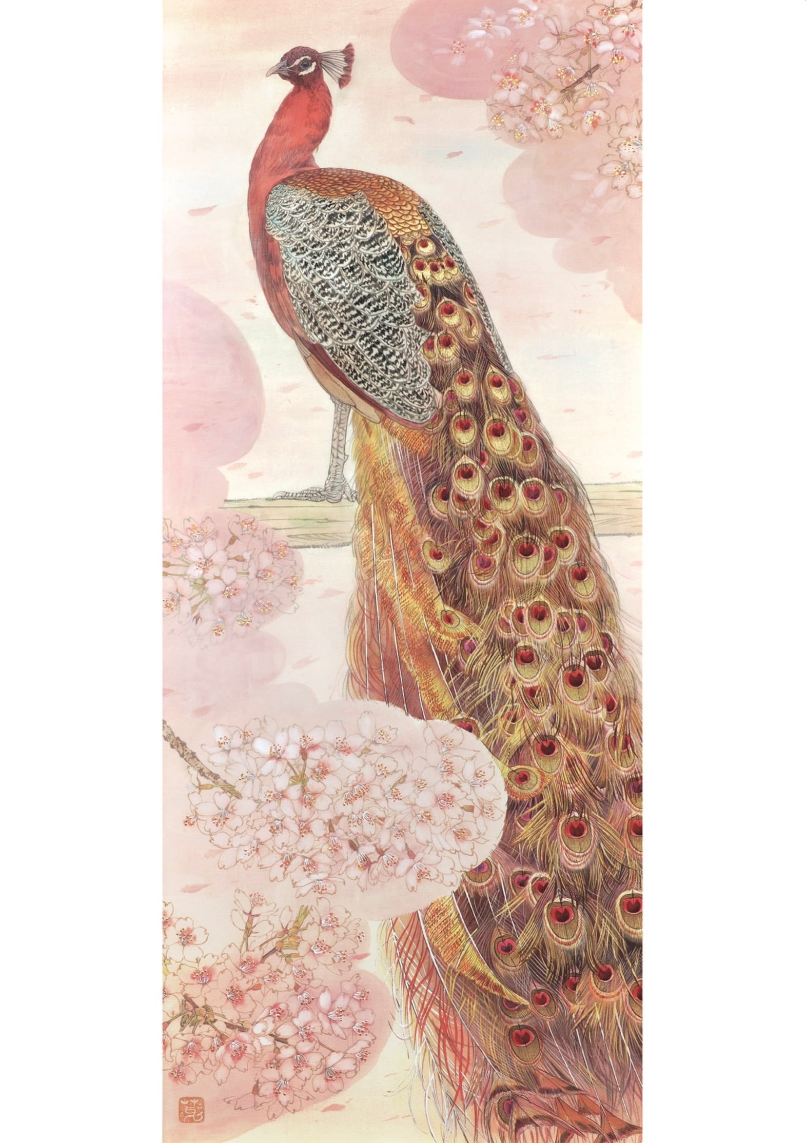 実際に赤い孔雀は存在しませんが、桜と調和する赤系の色味で羽を表現しました。
